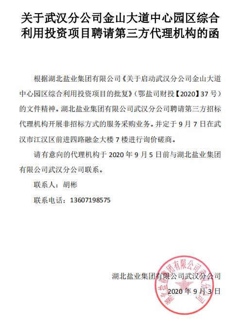• 關于武漢分公司金山大道中心園區(qū)綜合利用投資項目聘請第三方招標代理機構的函.pdf