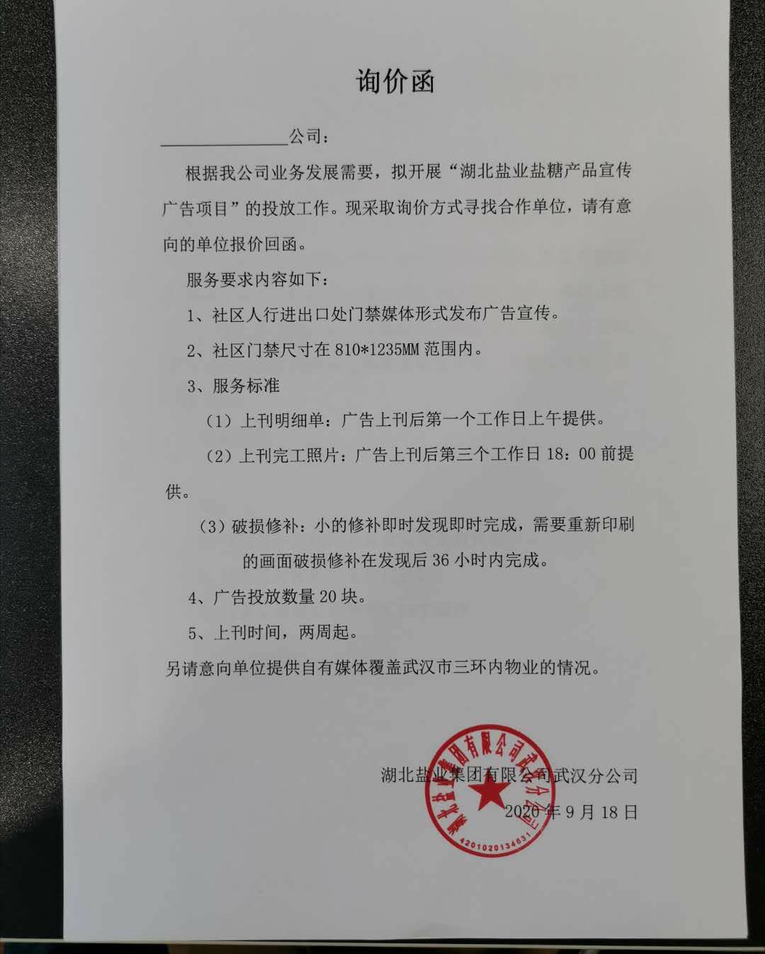 • 經(jīng)湖北鹽業(yè)集團有限公司武漢分公司對中山大道107號房屋招租報名企業(yè)資格定向評審及湖北鹽業(yè)集團有限公司武漢分公司法律顧問的資格審核,中山大道107號房屋目前擬租賃給武漢仟吉緣酒店管理有...